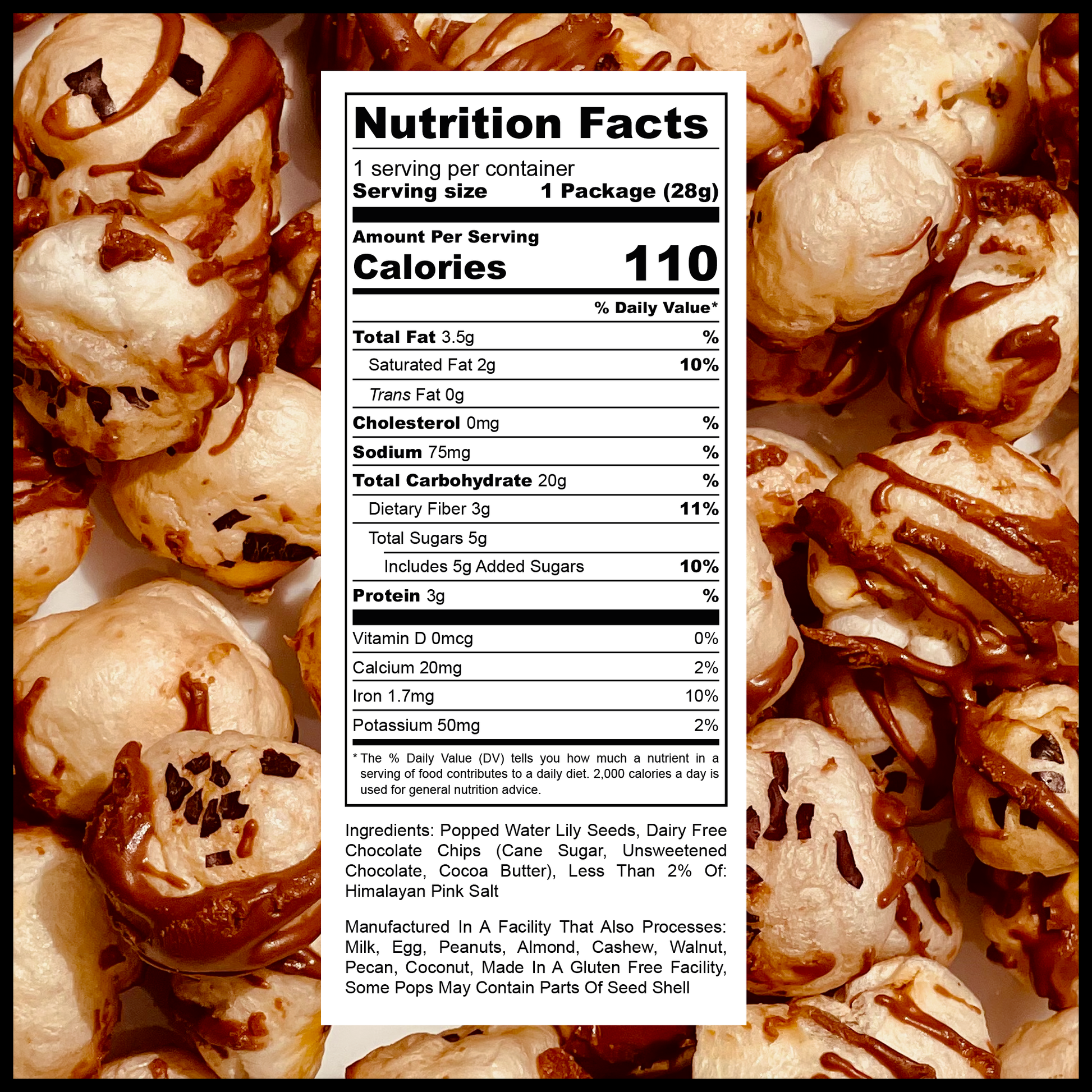 Popped water lily seeds are a protein-rich snack with the delicious flavor of chocolate. You can enjoy eating the entire bag or add it to your trail mix or as cereal with milk. Each pop is covered with local Michigan made vegan chocolate from bean to bar. The cocoa beans are from Ecuador that are fair trade.
