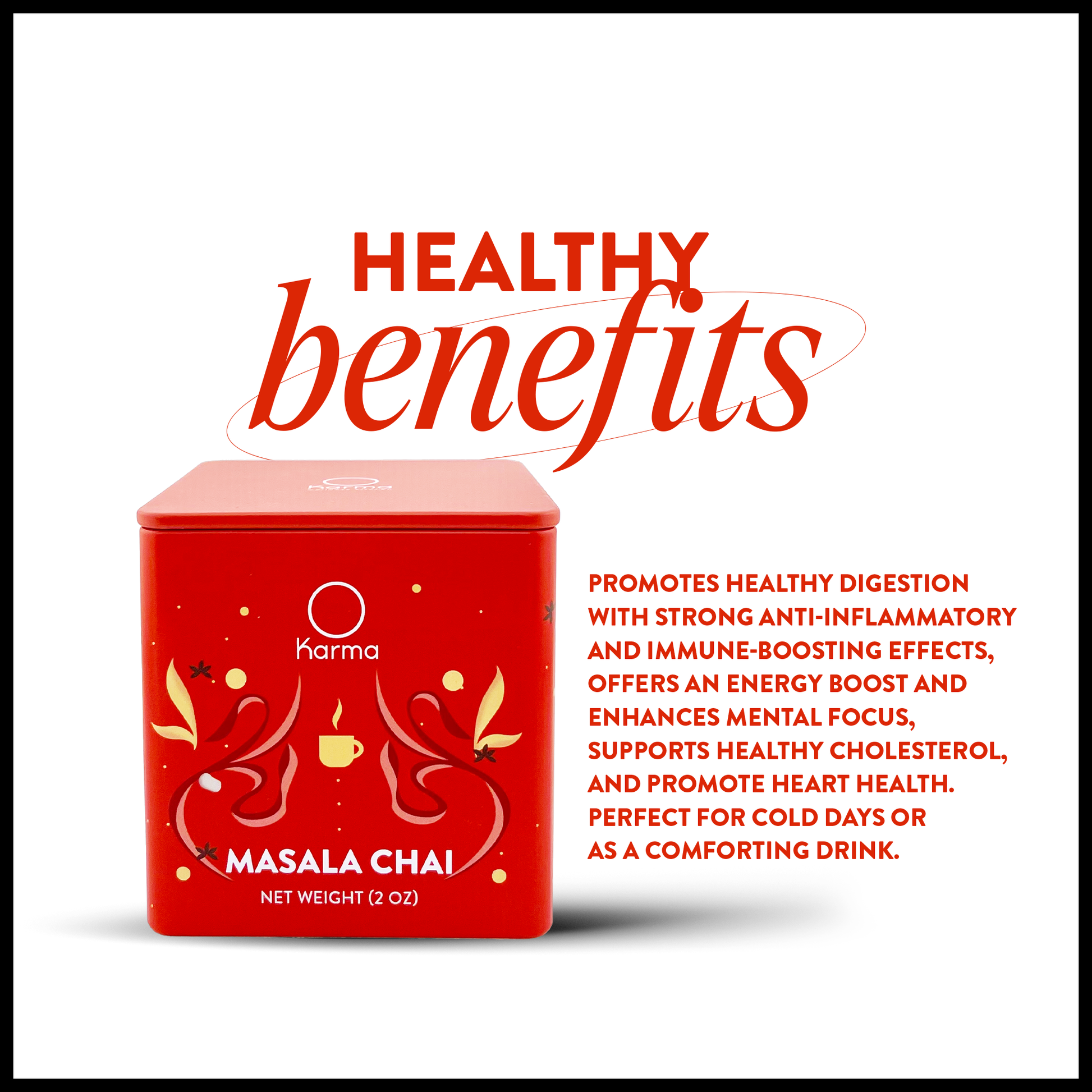 Masala Chai Boosts Energy and Mental Clarity. Cinnamon and cardamom help regulate blood sugar levels, support healthy cholesterol, and promote heart health. This Chai blend is perfect for cold days.